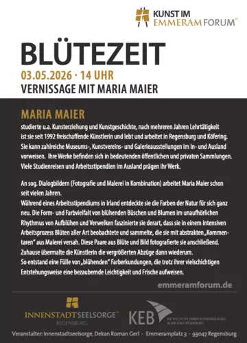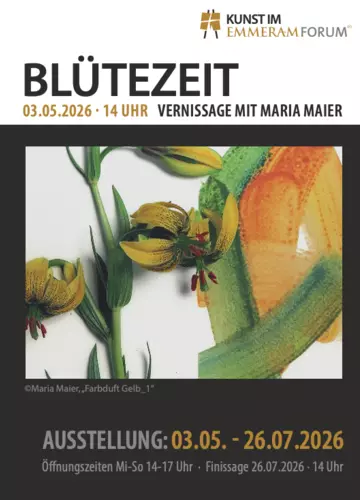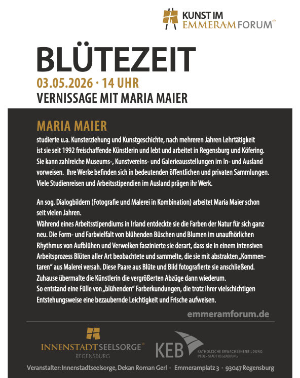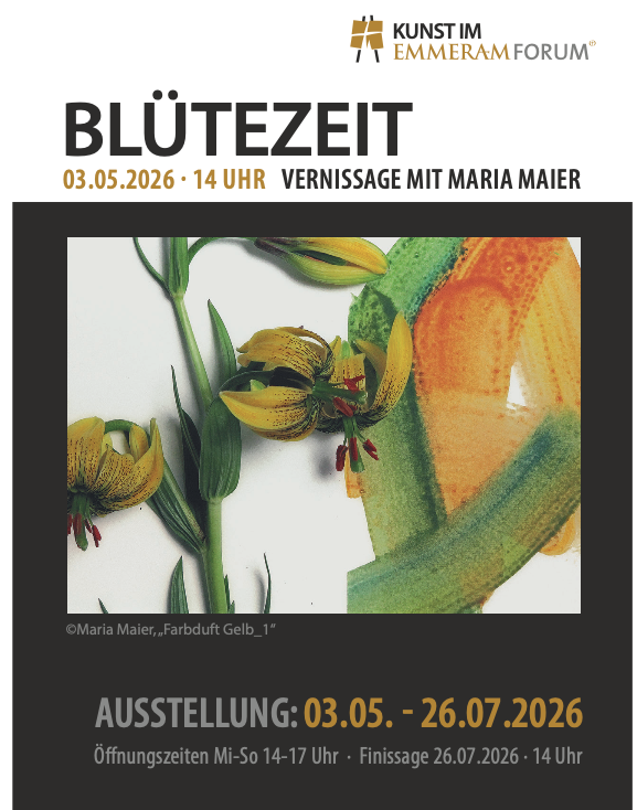 Seien Sie herzlich eingeladen zur Vernissage am 03. Mai 2026 um 14:00 Uhr im EmmeramForum. Die Ausstellung ist von Mittwoch - Sonntag von 14:00 - 17:00 Uhr geöffnet. Der Zugang ist kostenlos. Finissage ist am 26. Juli 2026 um 14:00 Uhr.